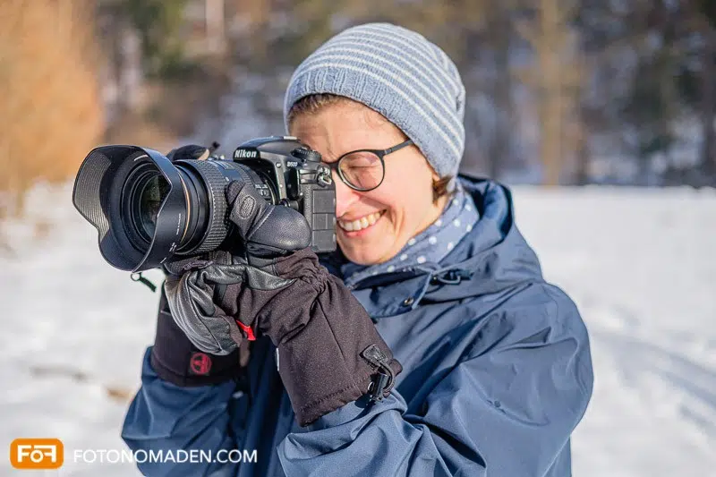 Die dünneren Innenhandschuhe schützen einerseits die Finger vor direkter Kälte, andererseits lassen sich damit die Knöpfe und Einstellräder der Kamera leichter bedienen. Das funktioniert auf unserer Nikon D500 wirklich super. Bei unserer kleineren Fujifilm X-T2 funktioniert es grundsätzlich auch, aber aufgrund des kleineren und drückbaren Wahlrades etwas weniger gut als bei der Nikon. Hier müssten die Handschuhe eigentlich noch dünner sein. Hier empfehlen wir dir die Kombination eines Layers (Merino Liner Light) und eines Shell-Handschuhs – mehr dazu in unserem Fotohandschuhe Layer System Artikel.